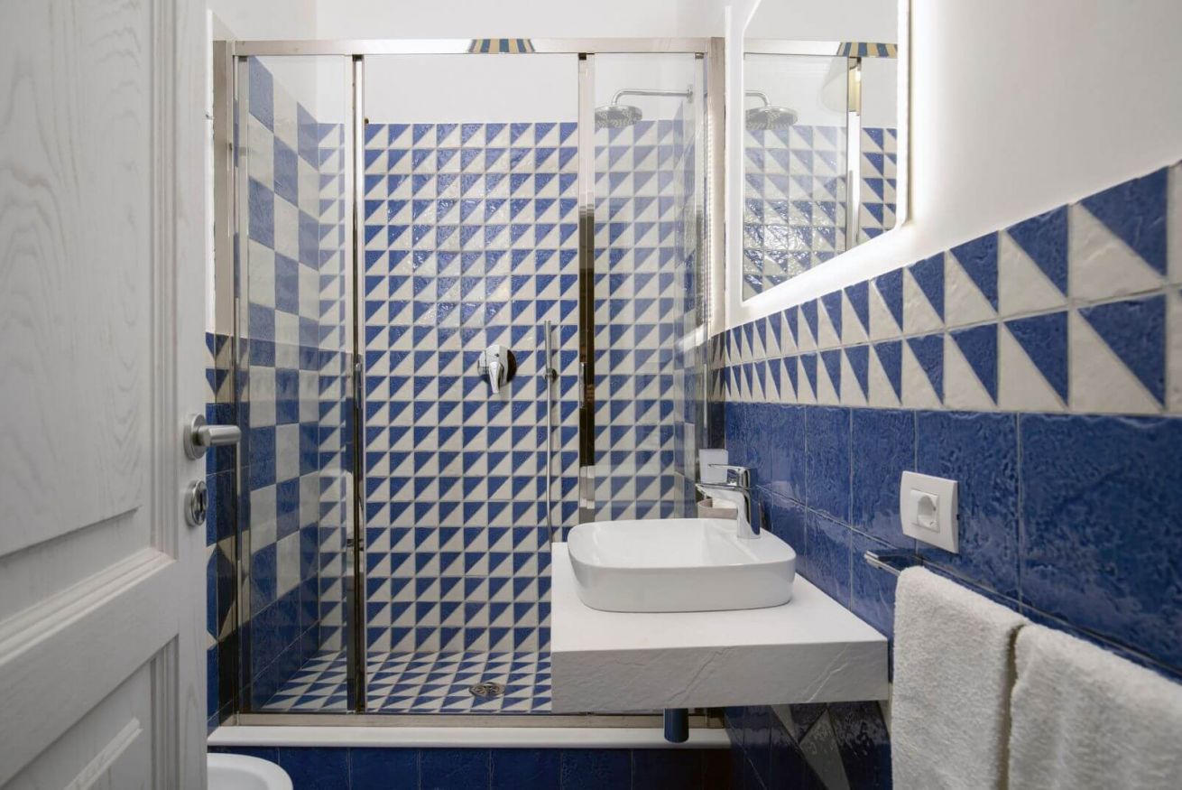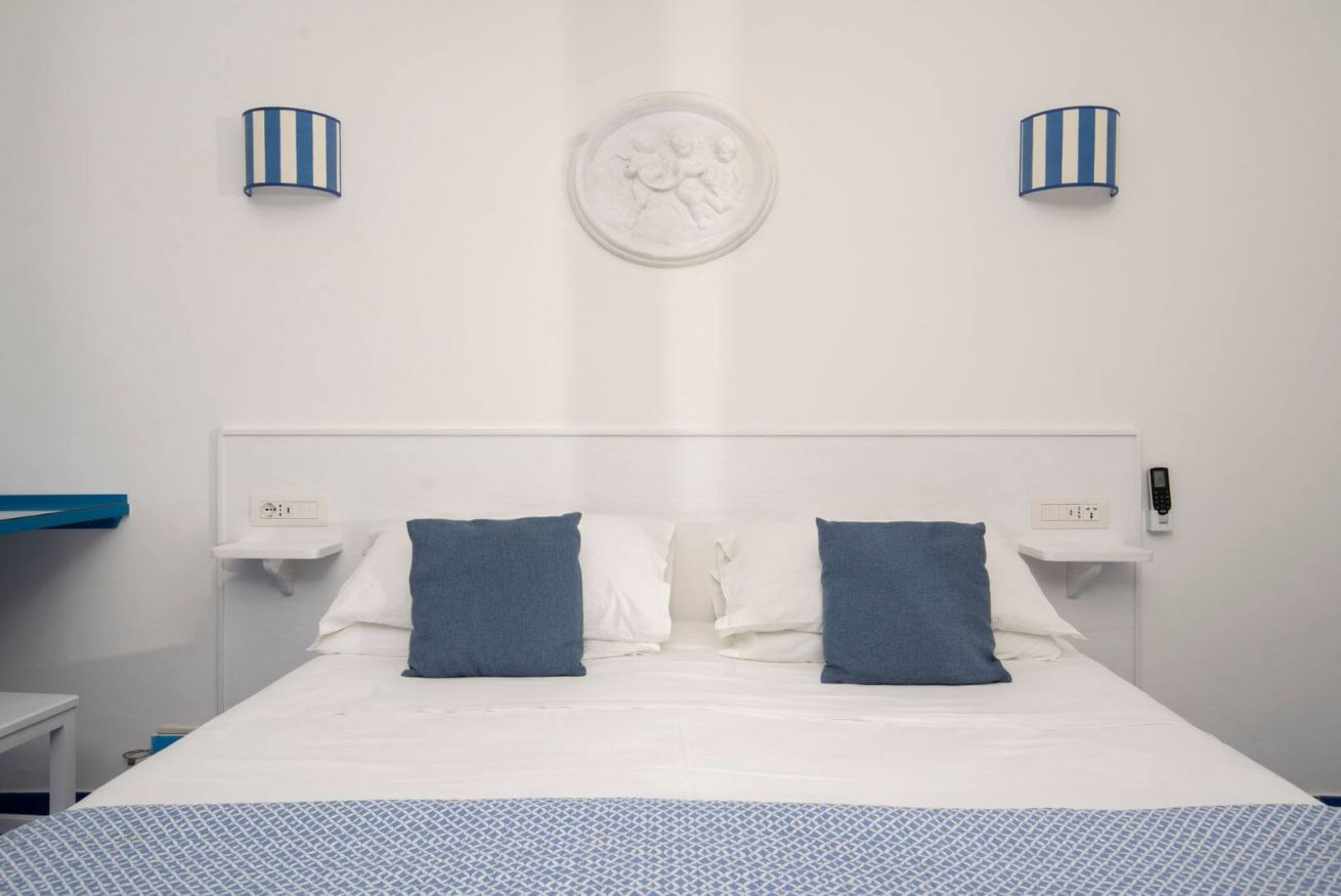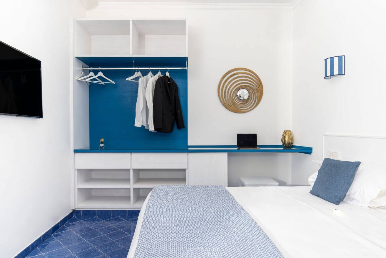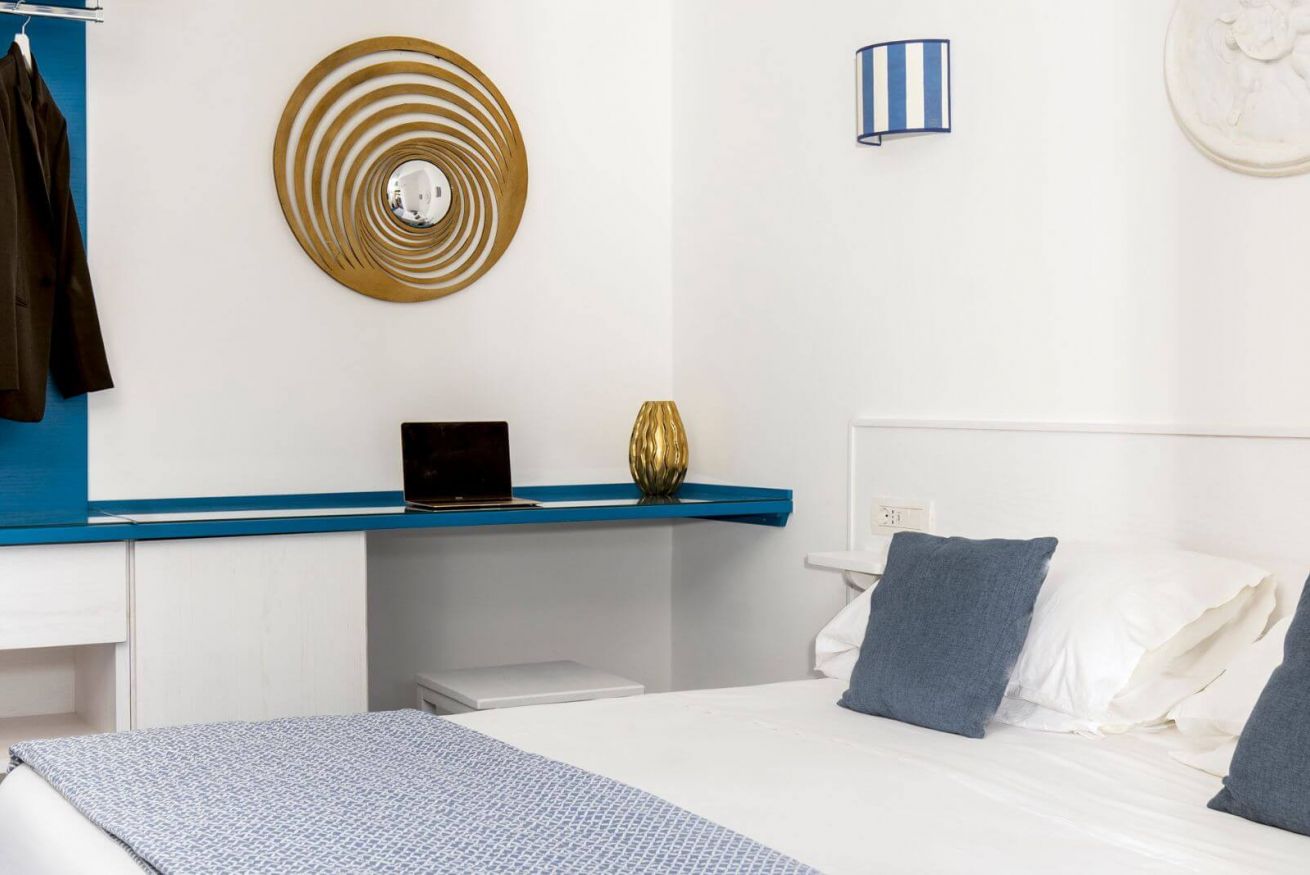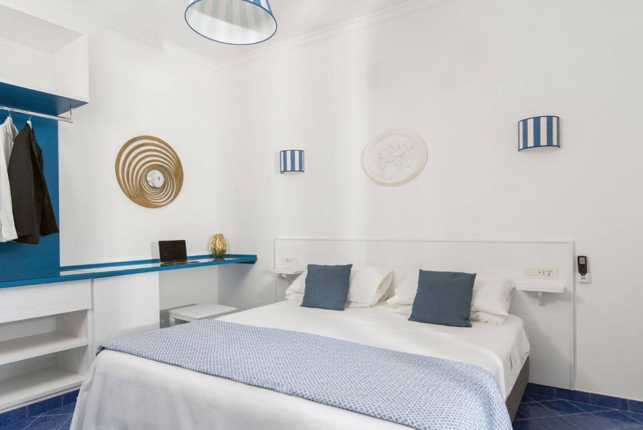 Camera climatizzata e dotata di bagno interno, pavimenti piastrellati, TV a schermo piatto, balcone arredato con vista parzialmente sul mare e bagno con doccia idromassaggio per 2 persone.